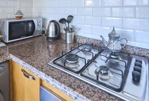 This one-bedroom apartment includes three beds and features a fully equipped kitchen with a stovetop, oven, microwave, and refrigerator. The living area has heating, a flat-screen TV, and free Wi-Fi throughout the unit. A washing machine is also available for guest use.
