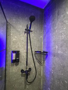 The apartment includes one bedroom with a hypoallergenic pillow and an electric blanket. Guests can prepare meals in the kitchenette, which features an oven, stovetop, refrigerator, and kitchenware. The living area contains a flat-screen TV with satellite channels, a sofa, seating area, and table. The bathroom has a walk-in shower stocked with shampoo.