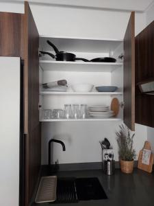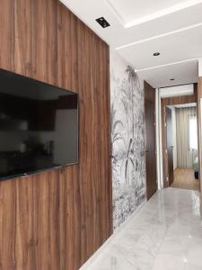 The apartment includes one bedroom and a fully equipped kitchen with a tea and coffee maker. Guests benefit from a washing machine, tumble dryer, heating system, and access to an elevator. The living area features a flat-screen TV for entertainment.