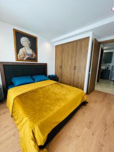 This one-bedroom apartment includes a fully equipped kitchen and one bathroom. Guests have access to a washing machine and heating for cooler seasons. Entertainment is provided by a flat-screen TV, while the living area features a separate kitchen space and a work desk.