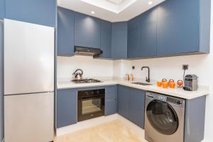 The apartment includes one living room, a separate bedroom with two beds, and a private bathroom featuring a walk-in shower and free toiletries. The fully equipped kitchen contains an oven, stovetop, refrigerator, coffee machine, kettle, and kitchenware. A flat-screen TV with streaming services is available for entertainment while the unit also provides a washing machine and wardrobe.